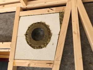 Der Wanddurchbruch in der Längsseite vom Wagen für das Ofenrohr ist bereits in der Wand vorbereitet. Es ist möglich ein 120er oder 100er Rohr einzubauen.