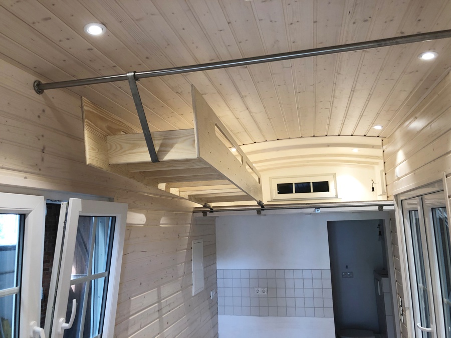 Ein Blick in den Wagen vom Balkon an der Giebelseite. Das Loft über dem Bad. Die Treppe (Leiter) zum Loft under der Decke festgemacht. Links der Sicherungskasten. Der Fliesenspiegel für die Küche mit Steckdosen, Abfluss und Anschluss für Brauchwasser.