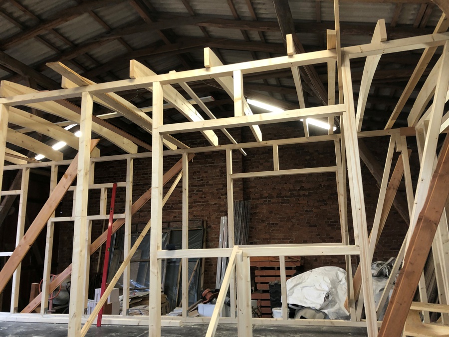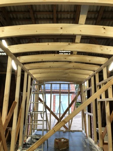 Ständerwerk mit Balkenlage rund und Schalung von unten.