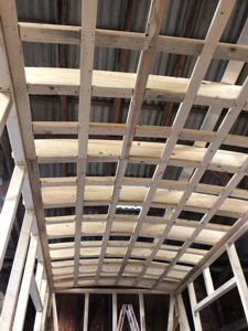 Der Wagen von innen mit der OSB-Verkleidung der Unterkonstruktion für die Profilbretter und die Deckenschalung von unten.